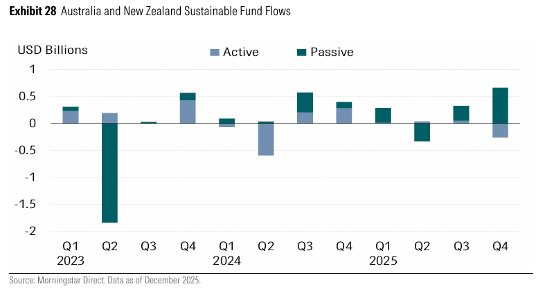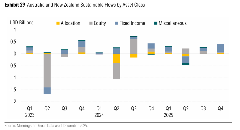 The Morningstar’s latest Global Sustainable Fund Review showed sustainable funds in two neighbouring countries attracted an estimated $US400 million in net inflows in the December quarter, lifting total 2025 investment to about $US730 million.
