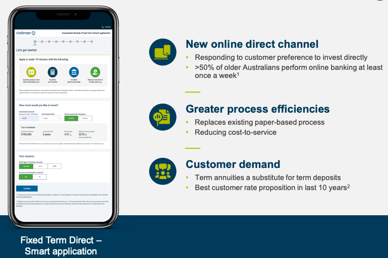 The investor briefing said the new direct channel for annuities sales was a response to customers’ preference to investment directly in circumstances where more than 50% of older Australians perform online banking at least once a week.