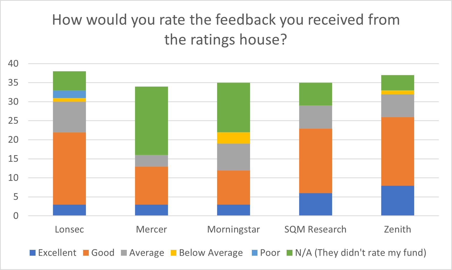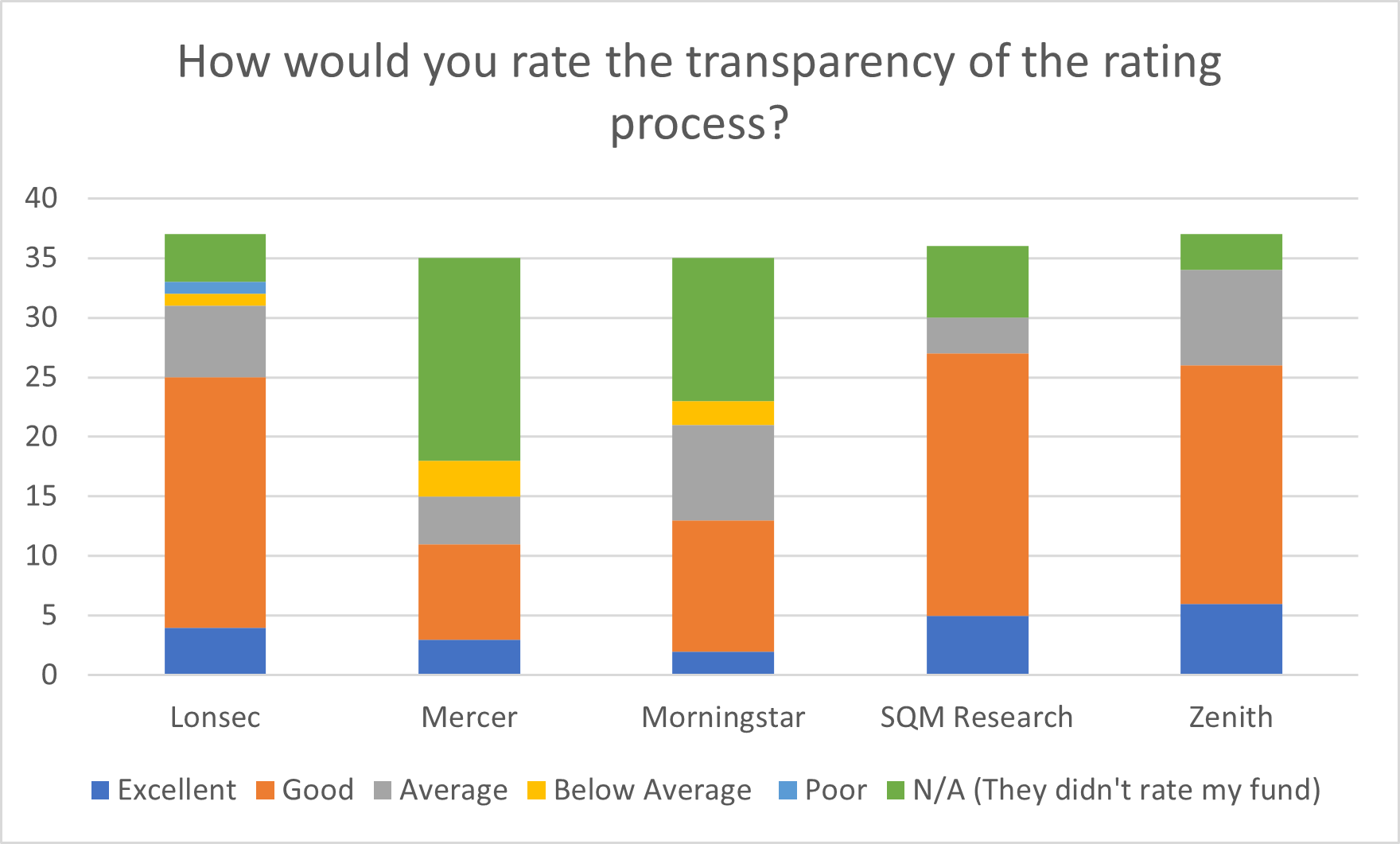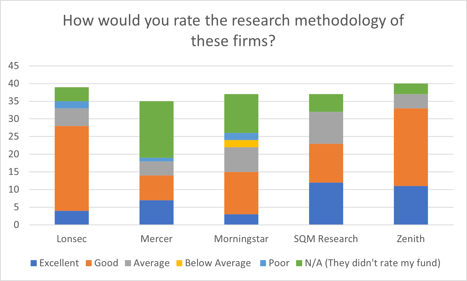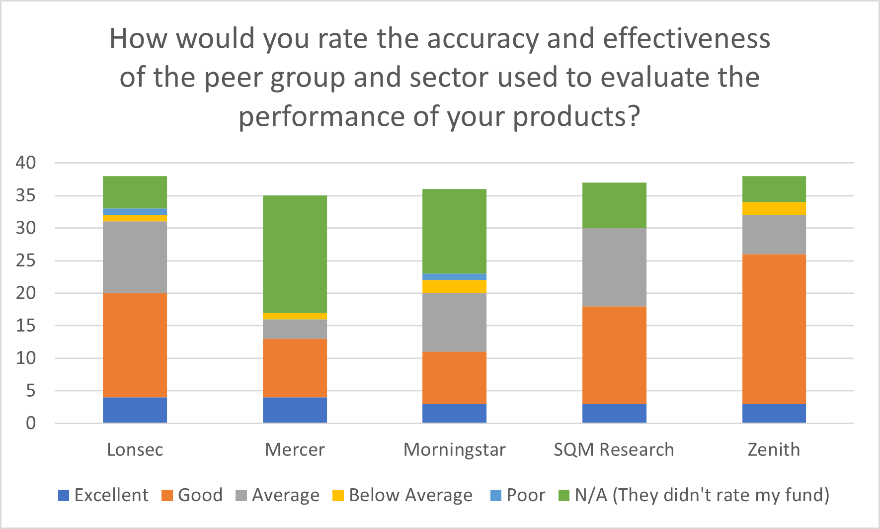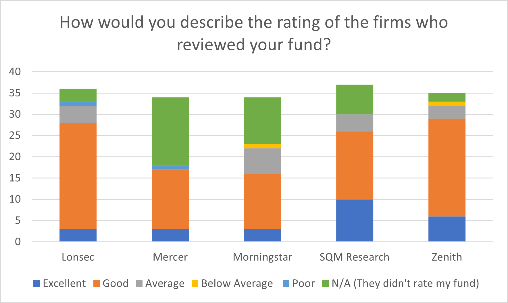 SQM led the charge with 17 per cent of ‘Excellent’ ratings and 73 per cent of ‘Good’ ratings from survey respondents, but comments revealed the disconnect between fund manager and research house representatives on the ins-and-outs of the ratings process.