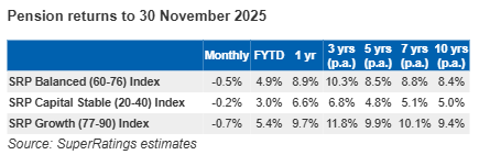 SuperRatings’ new figures have estimated the median balanced option returned -0.5% in November, ending a seven-month stretch of gains that had been steadily lifting members’ balances.