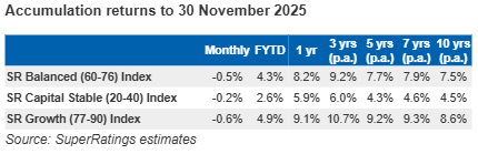 “While this month breaks the strong run, 2025 is well on track to be an above average year for member balances, with the 11 months to 30 November 2025 estimated to have returned 8.7% against a median of 7.1% for the full year since 2000.”
